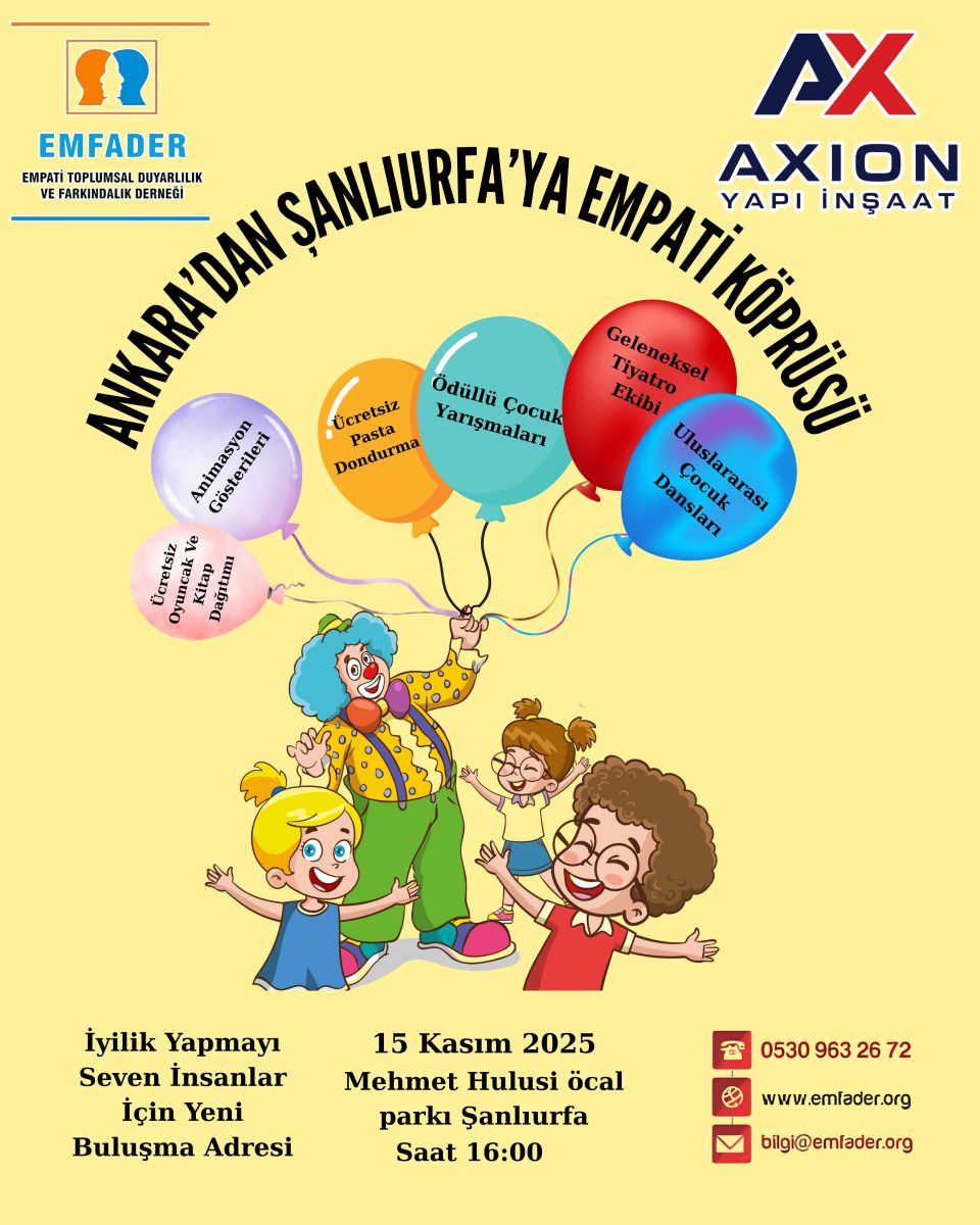Ankara’nın önde gelen firmalarından Aksiyon Gayrimenkul, Empati Toplumsal Duyarlılık ve Farkındalık Derneği tarafından 15 Kasım Cumartesi günü Şanlıurfa’da düzenlenecek Çocuk Festivali’ne anlamlı bir destek sunacak.