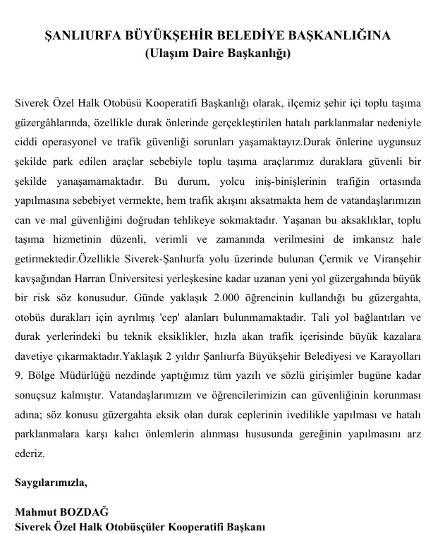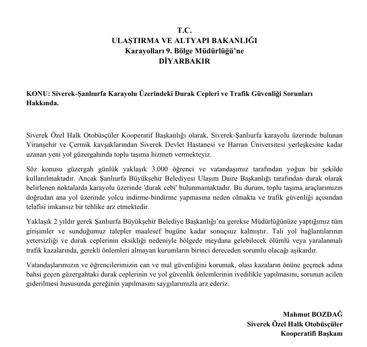 Siverek Özel Halk Otobüsçüler Kooperatifi Başkanlığı, Siverek-Şanlıurfa karayolu üzerinde yer alan yeni yol güzergâhındaki durak cepleri ve trafik güvenliği sorunlarını gündeme taşıdı. Kooperatif Başkanı Mahmut Bozdağ imzasıyla hem Karayolları 9. Bölge Müdürlüğü’ne hem de Şanlıurfa Büyükşehir Belediyesi Ulaşım Daire Başkanlığı’na ayrı ayrı dilekçeler sunuldu.