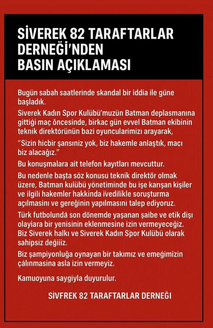 “Türk futbolunda son dönemde yaşanan şaibe ve etik dışı olaylara bir yenisinin eklenmesine izin vermeyeceğiz. Biz Siverek halkı ve Siverek Kadın Spor Kulübü olarak sahipsiz değiliz.”